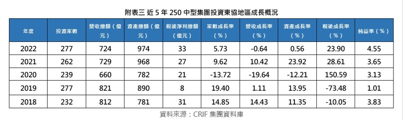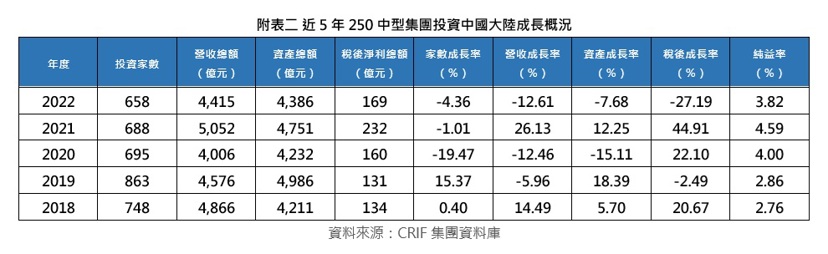 CRIF分析儘管2022年中型集團投資中國大陸的營收總額及稅後淨利分別比投資東協地區成長510%及412%,但在中國大陸及東協兩地區營運一降一升,與中國疫情後的急單效應結束、經營環境惡化不利中型集團發展,以及供應鏈外移有密切關係。尤其中型集團投資中國大陸家數由2019年的863家下降至2022年的658家,四年間投資家數減少205家之多,顯示中型集團也正加速將中國大陸產能轉向東協地區或其他地區的佈局。