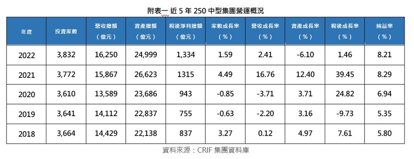 根據CRIF最新發布的2024「250中型集團企業研究」調查結果顯示,新進榜集團數量大幅增加,讓中型集團排名呈現大洗牌。儘管中型集團因板信銀行集團晉升至100大集團,使得資產總額衰退6.1%,下降至2兆4,999億元;不過分子企業家數連續兩年創新高來到3,832家,營收總額小幅成長2.41%,達到1兆6,250億元,並為連續兩年創歷史新高;稅後淨利總額小幅成長1.46%,來到1,334億元,連續兩年獲利站穩1,300億元之上,並寫下首次連續三年獲利創歷史新高的紀錄。純益率8.21%,連續兩年達8%,維持高檔(詳參附表一)。相較於300大集團稅後淨利衰退8.85%,顯示中型集團在疫情後進入營運活躍期。